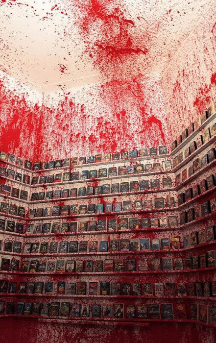This collection is massive. You see Pennywise, Ghost Face, Candyman, Michael Myers—everyone. Lots of these posters are testaments to those timeless horror films, but many are smaller, dirty fliers of a much more graphic nature. Screaming innocents, ripped clothes, viscera. Apart from the brief dread, an overwhelming sense of triumph comes over you. This is dedication.In a sensible, more digestible world, monsters would play their role. Vicious deep sea creatures would protect the ocean with fervor, attacking any fisherman that dared to encroach on their territory. Vampires hunt humans due to their inherit demonic nature; they are never to be trusted by society, always to be dealt with before their disease spreads. The atrocities of life obviously point towards a secret cabal, filled with the elite who bar us all from true enlightenment. In your world, it makes sense.The Thing